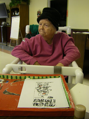 Resident Mary came over to watch us "being creative" for a few minutes yesterday and, when invited, made a mark or two on a cartoon with a red felt-tip pen.That's a start anyway....